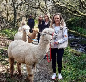 Waterfall Farm offers people the chance to enjoy walking our gorgeous boys Oisin, Cusco, Ziggy and Macca Pacca (with Yogi,Chewy and Pablo soon to join the gang!) along our stunning riverside walk, under a canopy of ancient trees, past pools and waterfalls with an array of wild flowers, the sound of the river and bird song, an opportunity to completely immerse yourself in nature in the company of these amazing animals. We also meet and feed the girls and learn about their fascinating and unique history. There s also Captain Jack and Fat Freddy, the mini shetland ponies and Pepe and Gomez the mini donkeys, bantam ducks and hens. The entire experience takes aprox 1 hour, there s a picnic table and toilet and visitors are welcome to stay as long as they like after the walk.