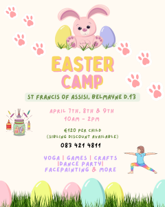 Located in St Francis of Assisi primary school, Belmayne D.13. Camp days are April 7th, 8th & 9th from 10am till 2pm. Cost is €120 per child, sibling discount is available please contact to enquire.