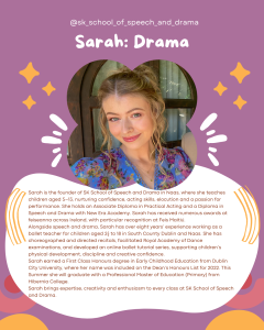As a registered member of the Speech & Drama Teachers of Ireland, Miss Sarah is passionate about fostering a love for performance while equipping students with essential life skills.
